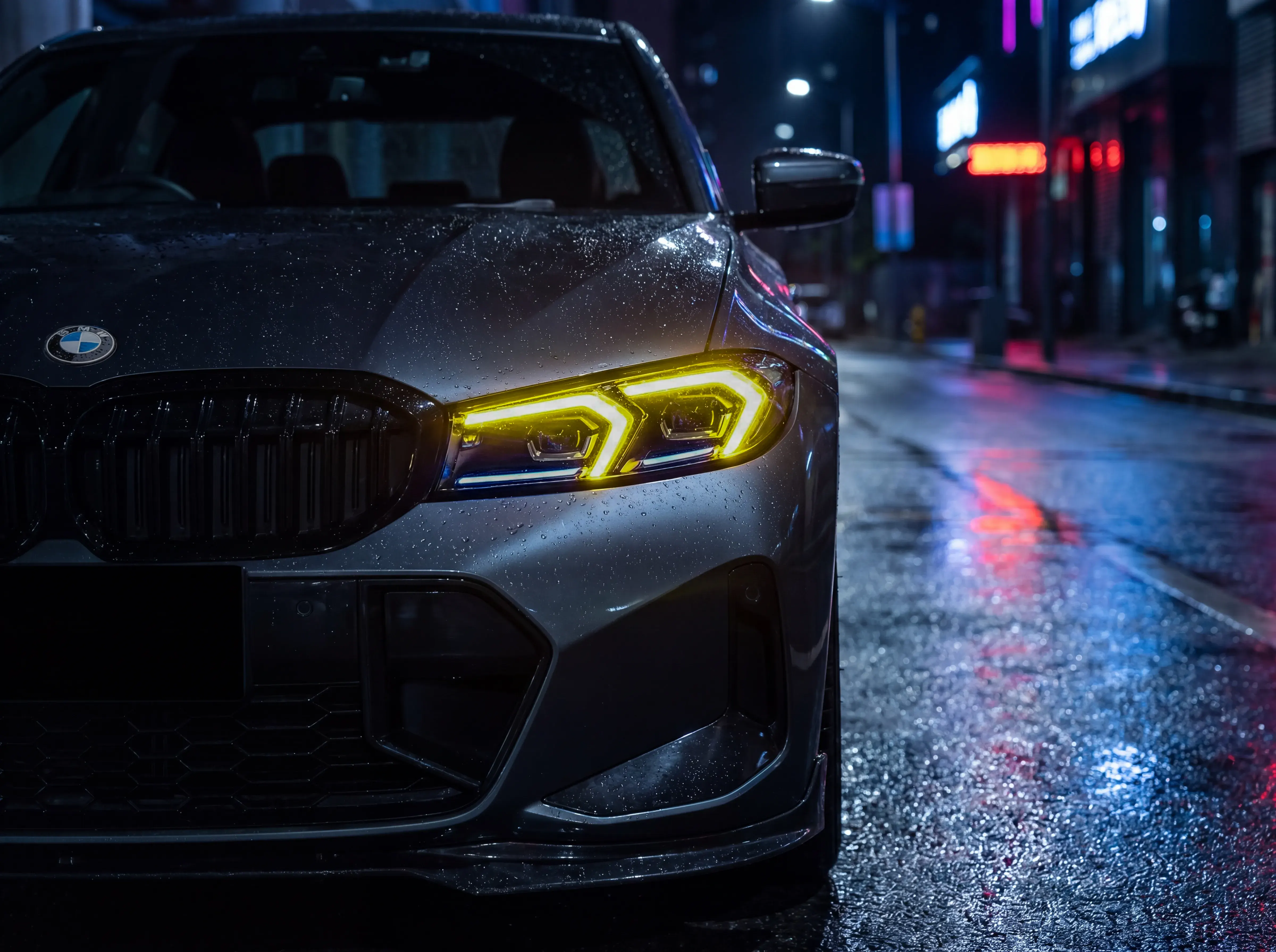 Der G20 LCI hat alles geschärft — flachere Scheinwerfer, neu gestaltete Tagfahrlicht-Grafiken und bei Fahrzeugen mit Laserlicht die markanten blauen Akzente, die sofort die Premium-Ausstattung signalisieren. Diese Module geben Ihnen das, was BMW weggelassen hat: umschaltbares CSL-Gelb. Aktivierbar über den Fernlichthebel in unter zwei Sekunden, zusätzlich mit Stroboskop, Pulsieren und einem Automatikmodus, der an Ihr Abblendlicht gekoppelt ist. Das Weiß ist exakt auf die Farbtemperatur Ihres originalen Laser-Tagfahrlichts abgestimmt; das Fahrzeug sieht auf den ersten Blick absolut serienmäßig aus.