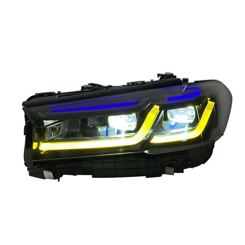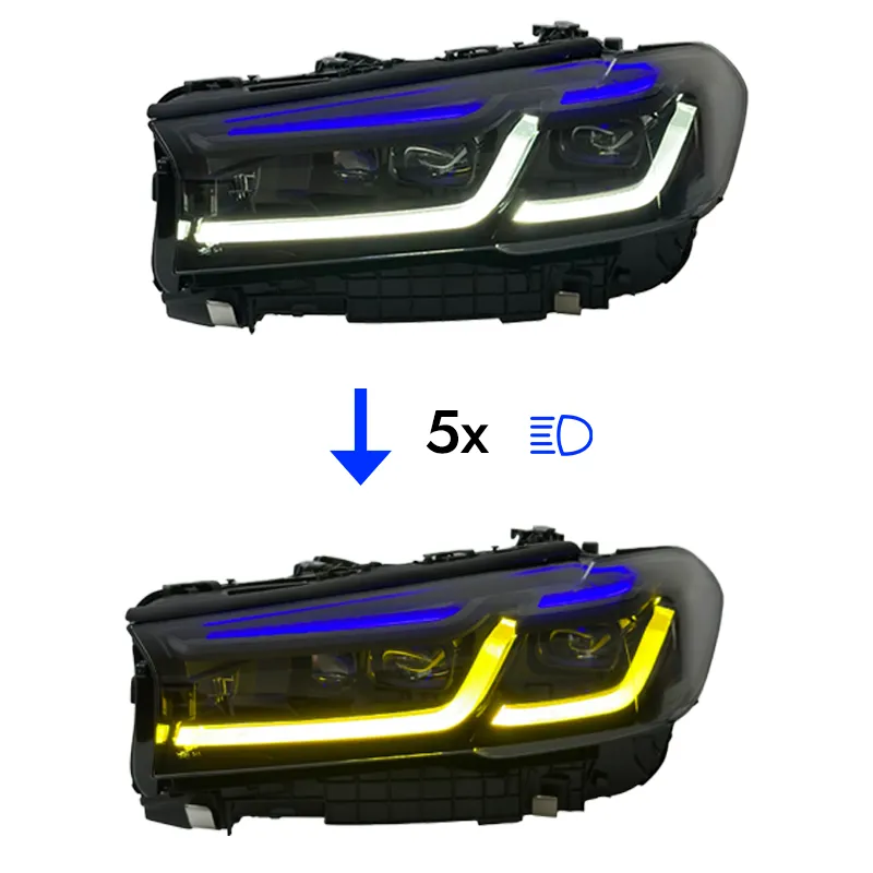 OEM-look LCI Laser upgrade for G30: direct replacement on LCI 2021–2023 (any original headlight), and a clean pre-LCI to LCI headlights retrofit for 2018–2020 when paired with an LCI front bumper. Available as an OEM-style white-only DRL replacement or as a more aggressive CSL-inspired Yellow/White DRL variant. Road-legal (E-mark, DOT/SAE, TÜV accepted) when used in white DRL mode; yellow DRL is best reserved for shows/off-road use.