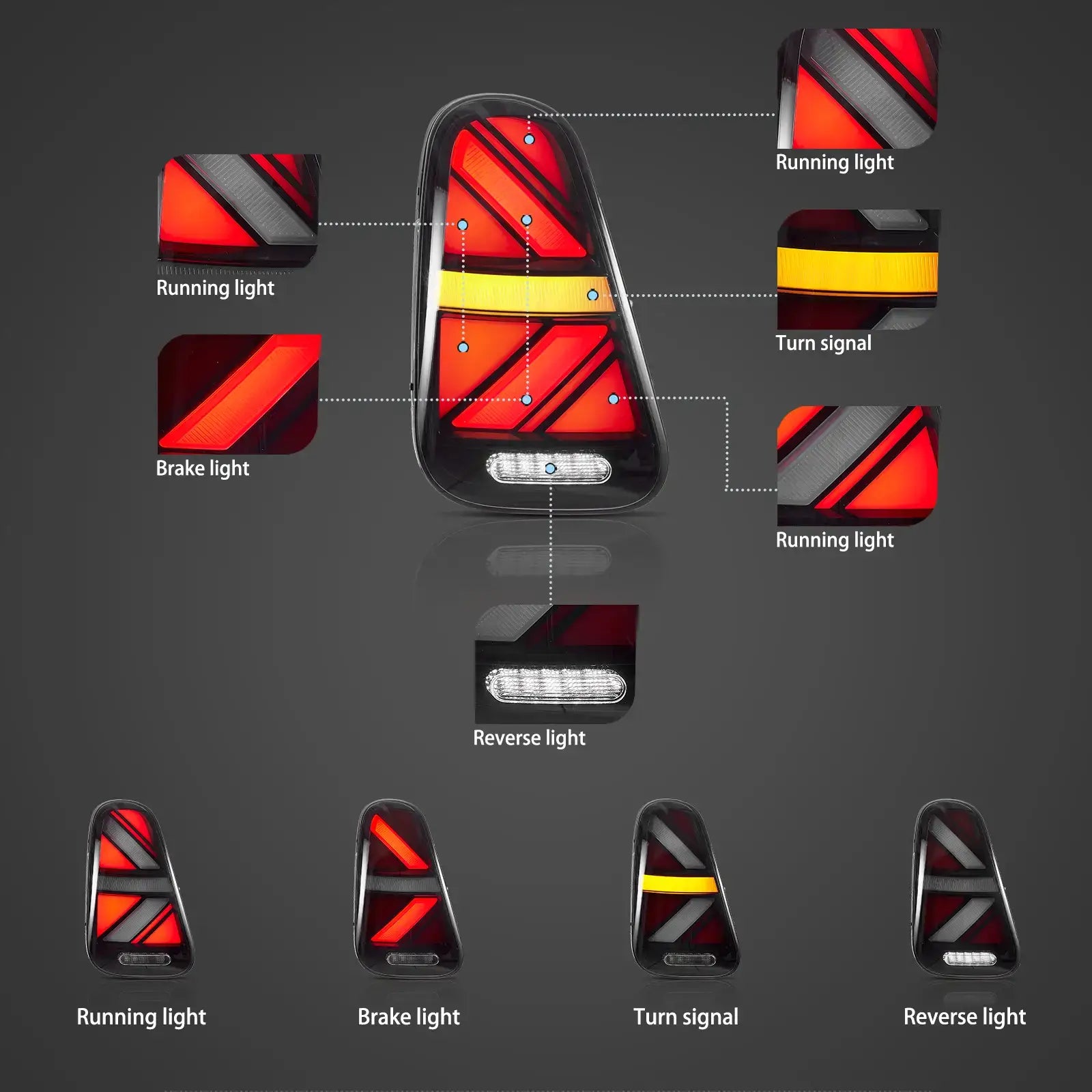 OEM-stiilis täis-LED Union Jack tagatuled Mini Cooperile R50 (Hatch), R52 (Cabrio) ja R53 (Hardtop), mudeliaastad 2001–2006. Punane LED ääre-/pidurituli, merevaigukollane järjestik suunatuli, valge LED tagurdustuli ning dünaamiline käivitus ("breathing") animatsioon. Plug-and-play tehaseliidestega. E-märgisega EL teedel kasutamiseks. 1-aastane tootjagarantii alates ostukuupäevast.