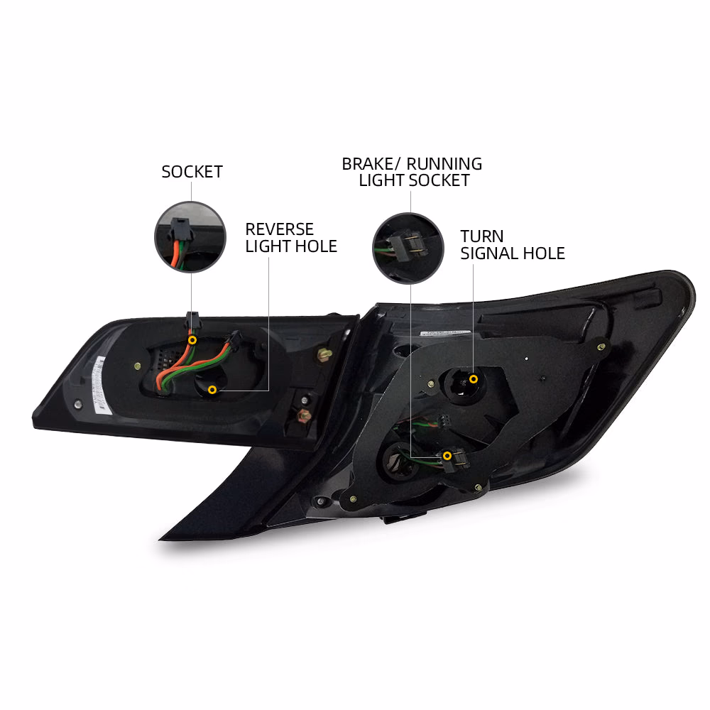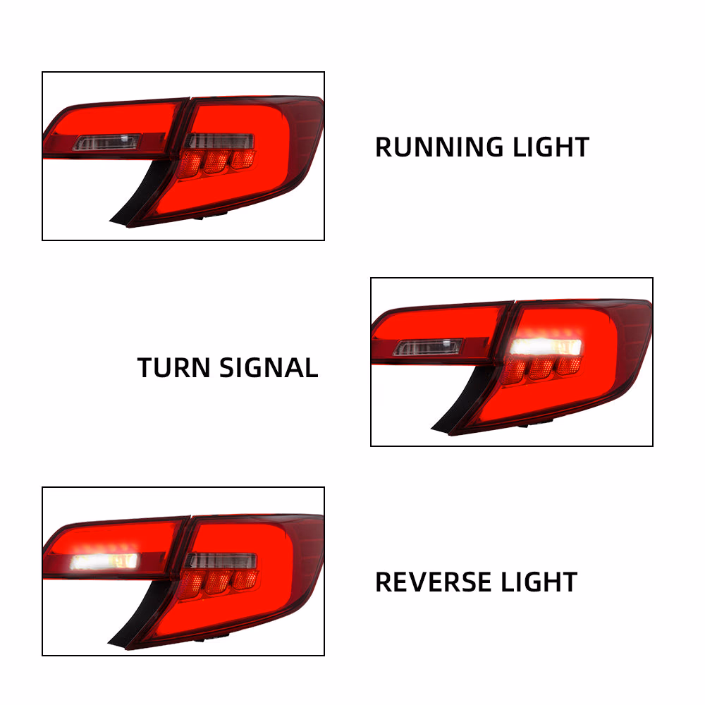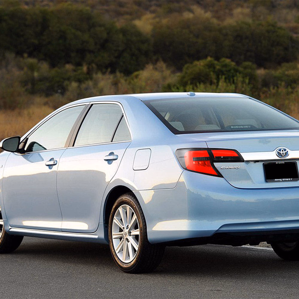 Paire de feux arrière plug-and-play style OEM pour Toyota Camry XV50 2012–2014 (versions standard, avant restylage). Lentilles fumées avec feux de position LED et frein LED. Réutilise les ampoules d’origine pour clignotant et marche arrière.