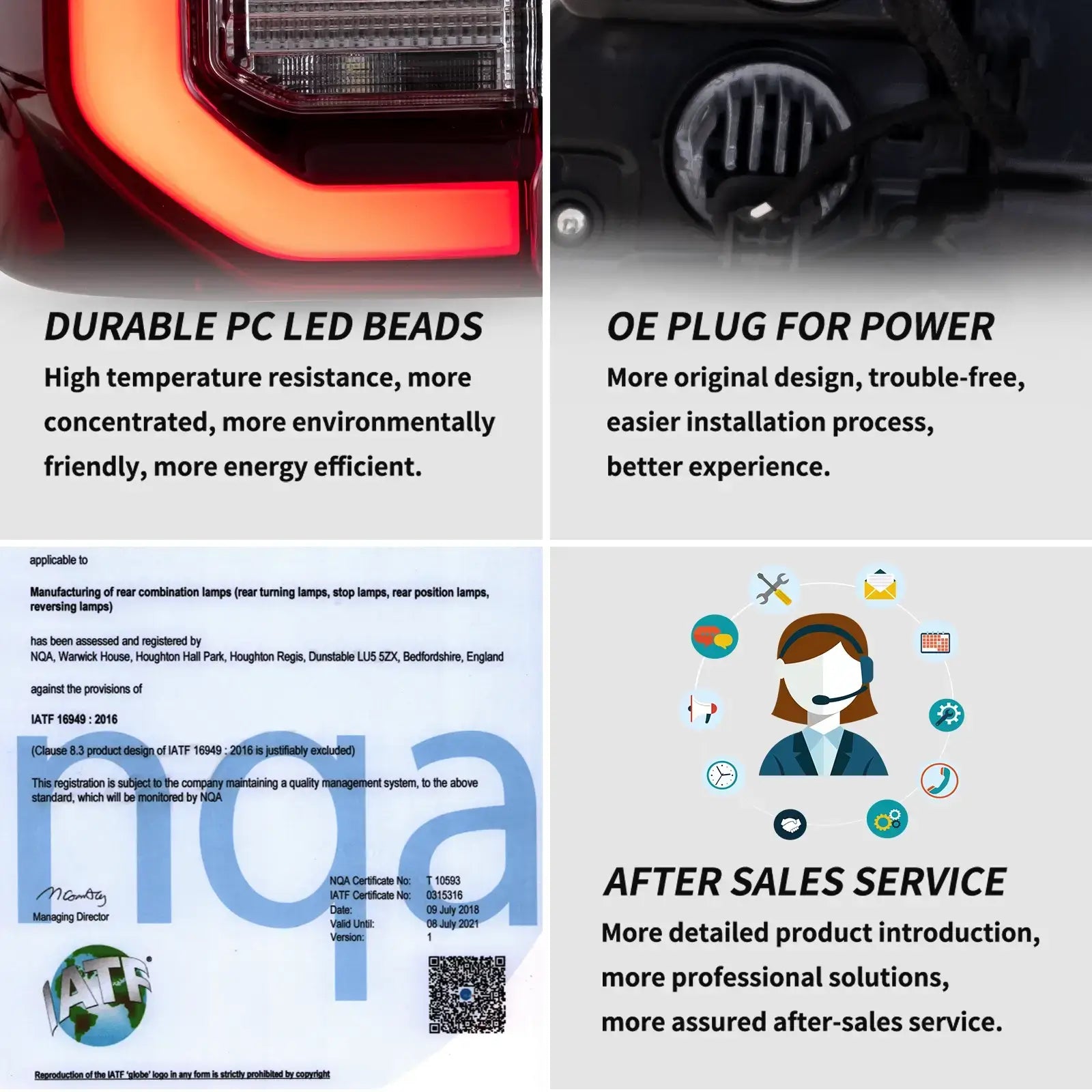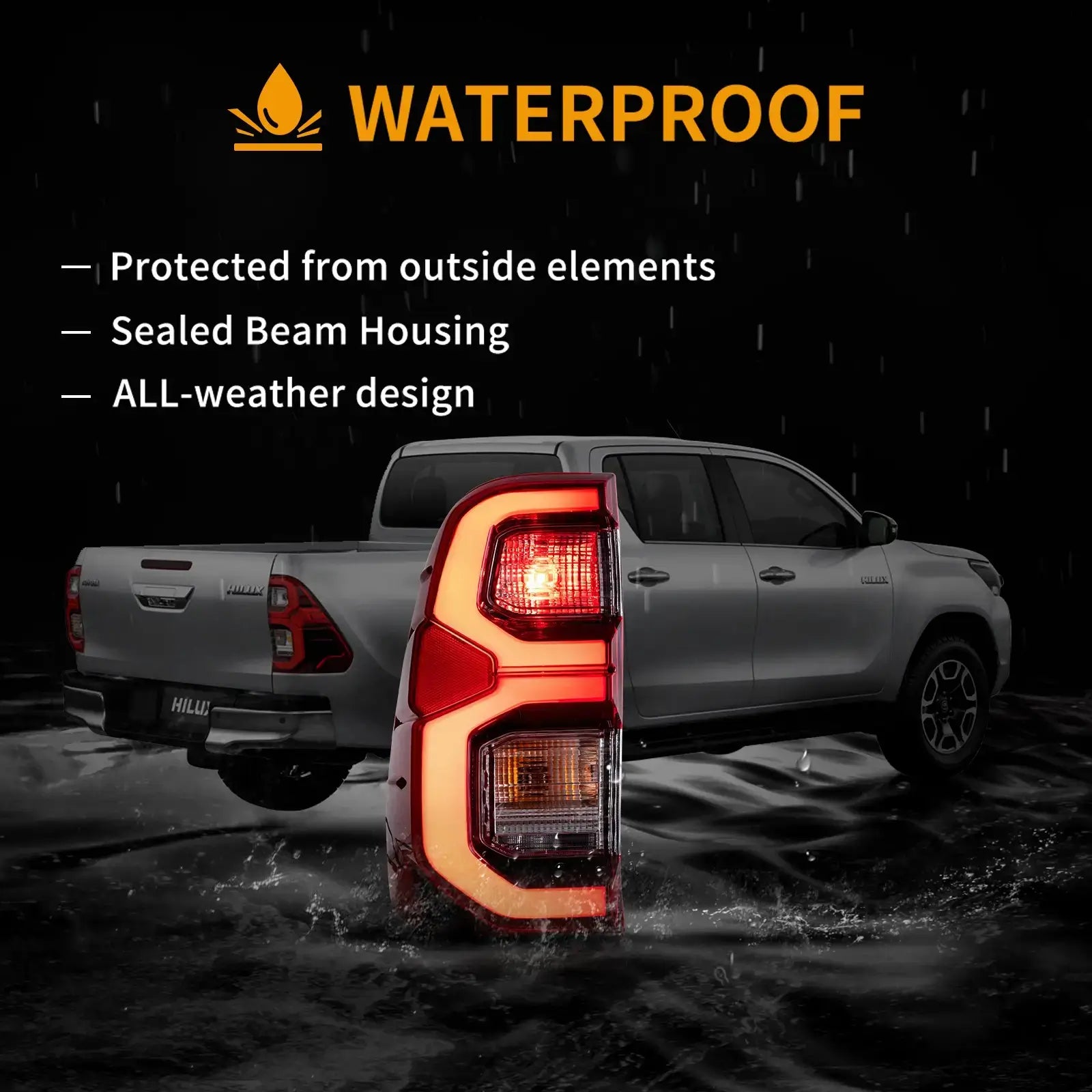 Paire de feux arrière plug-and-play style OEM pour Toyota Hilux SR5 (Revo) 2015–2022, 8e génération (GUN125, GUN126R). Utilise les connecteurs et points de fixation d’origine pour une installation propre. Disponible en Rouge clair ou Fumé.