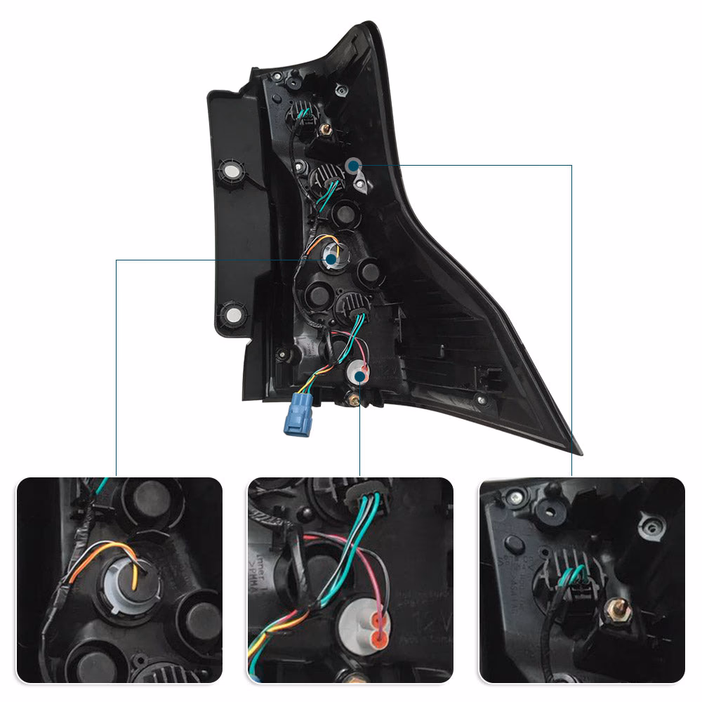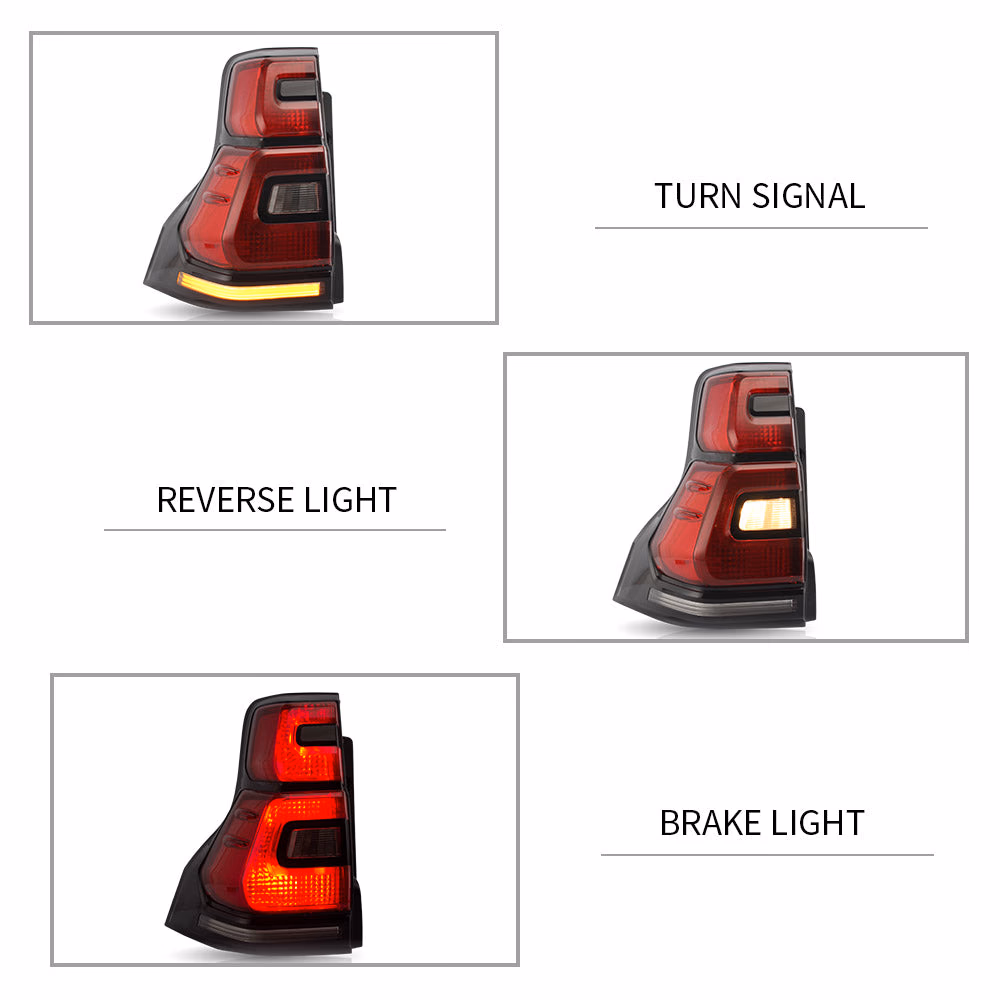 Coppia di fanali posteriori stile OEM plug-and-play per Land Cruiser Prado 2010–2016 (J150) con fanali alogeni di serie. Posizione, stop e retromarcia completamente LED con frecce ambra sequenziali.