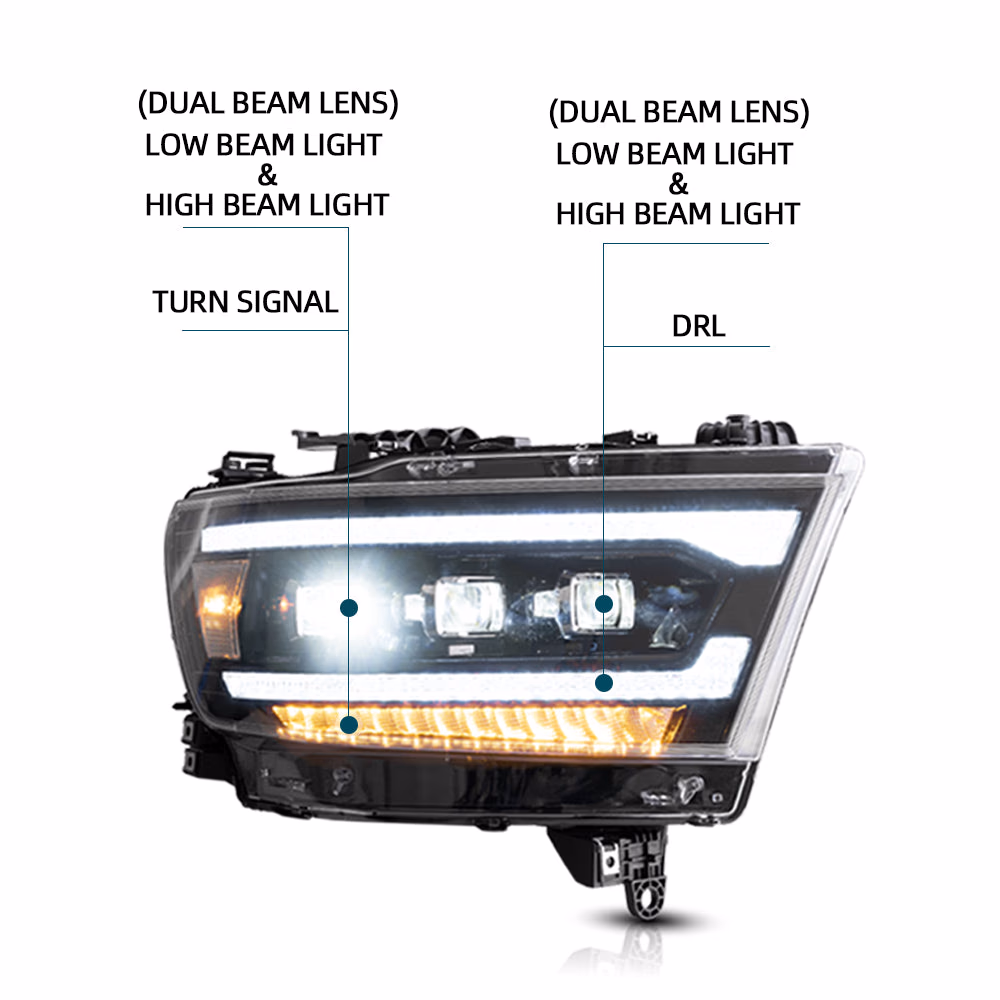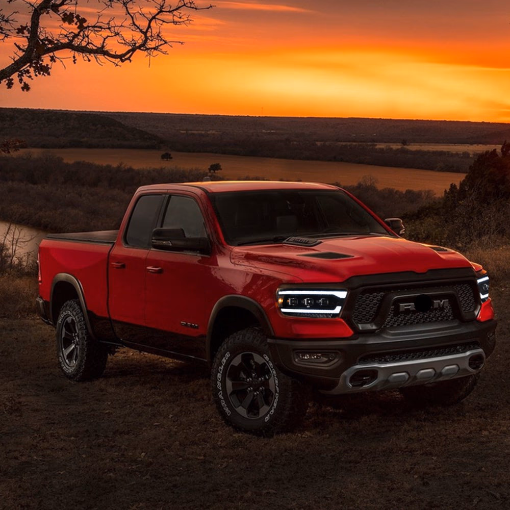 Światła mijania i drogowe w pełni LED z czystymi prowadnicami świetlnymi oraz bursztynowymi kierunkowskazami sekwencyjnymi — modernizacja plug-and-play dla DT Tradesman, Big Horn, Laramie, Rebel i Lone Star.