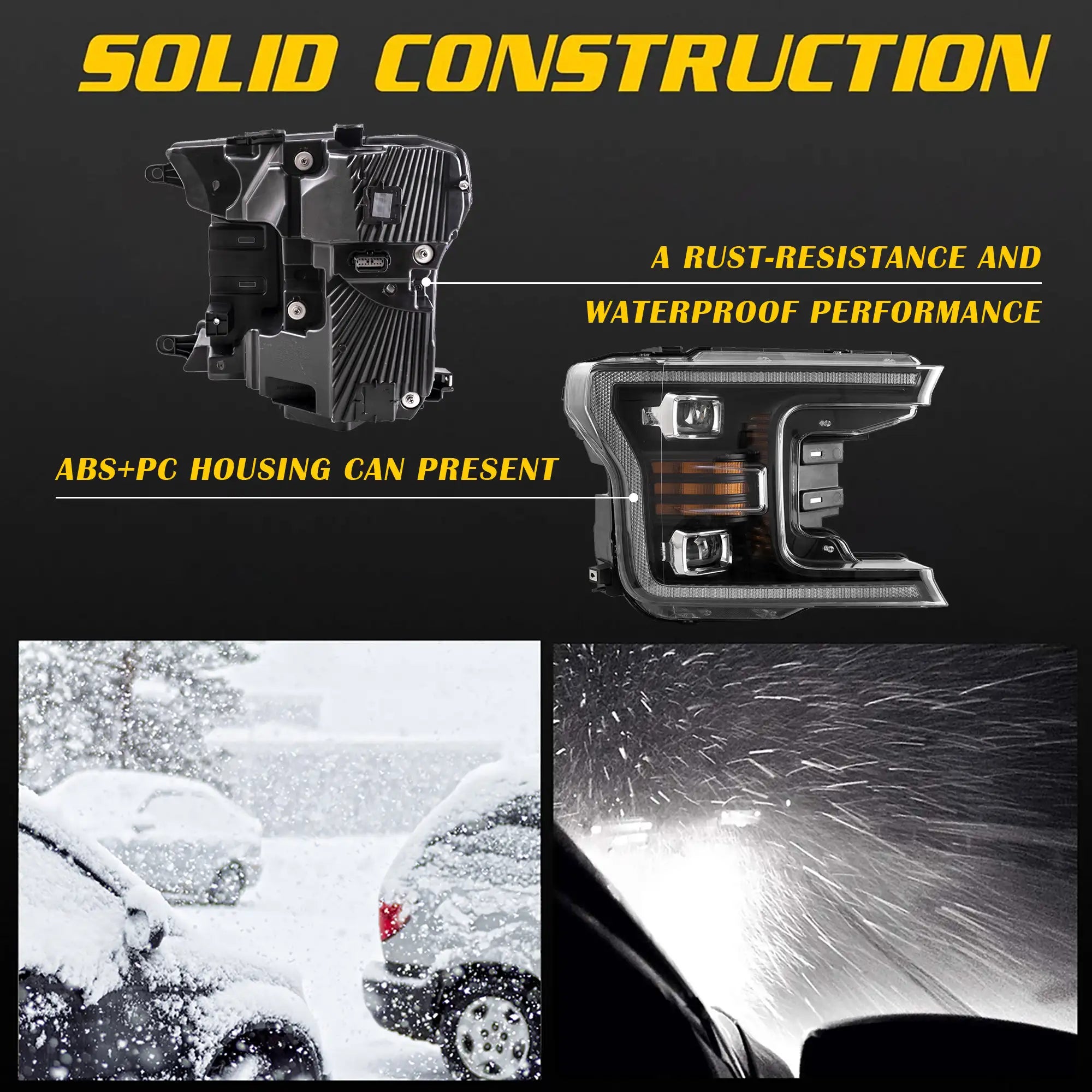 Projektorowe LED mijania/długie z DRL i animacją startową — bezpośrednie dopasowanie OE, plug-and-play dla F-150 2018–2020 (bez Raptor).