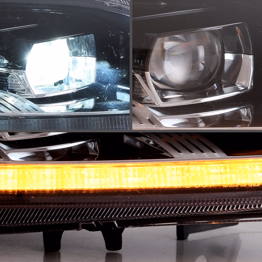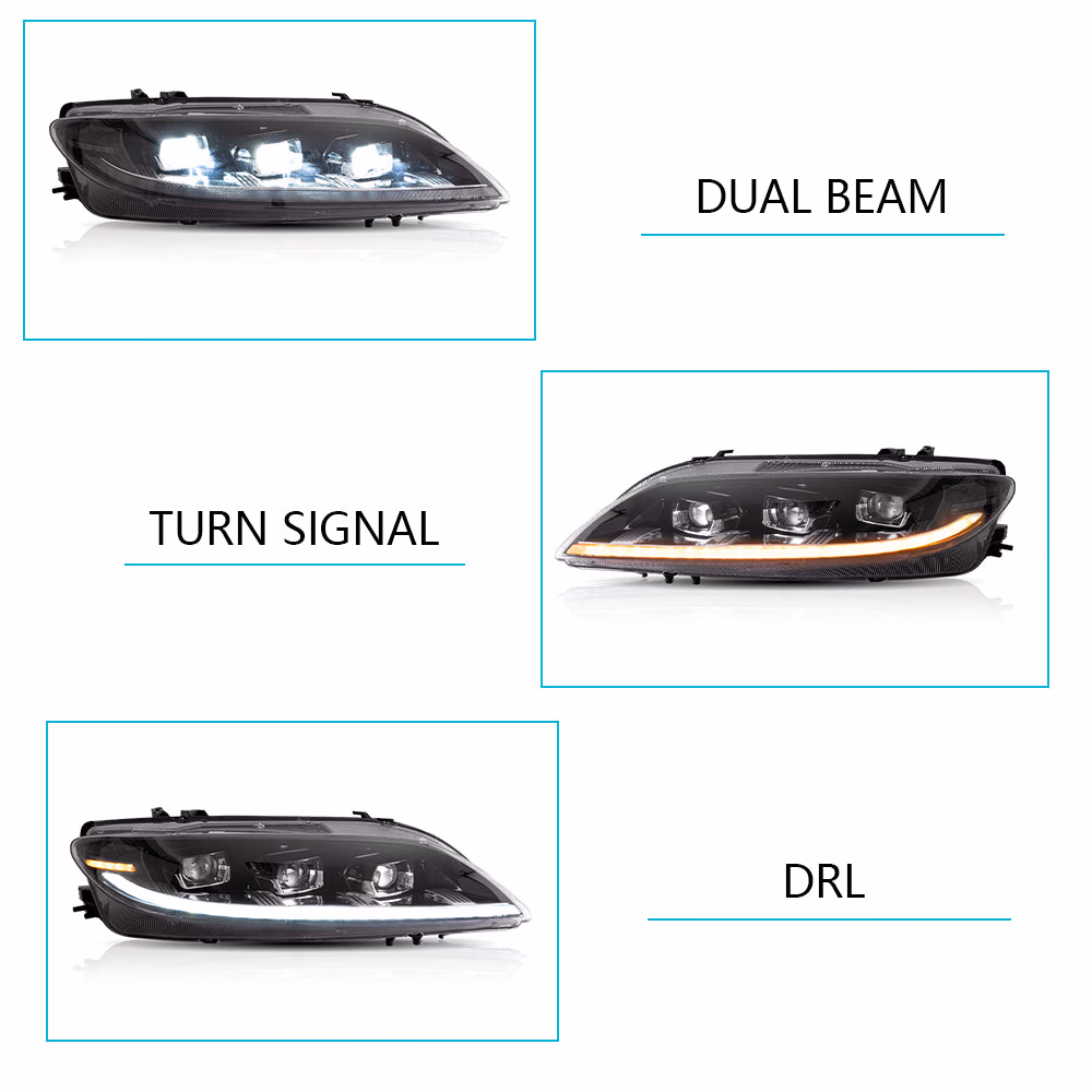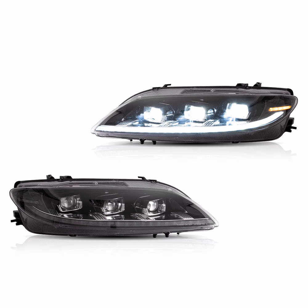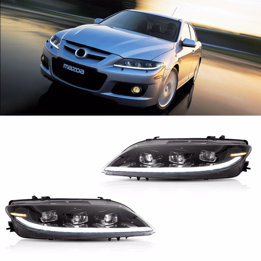 Bezpośrednie, w stylu OEM Full-LED lampy przednie do Mazda 6 / Atenza (GG1, przedlift) sedan. Wyraźne bi-LED mijania/długie, białe LED DRL oraz bursztynowe sekwencyjne kierunkowskazy z animacją powitalną/„breathing”. Plug-and-play dla aut ze stockowymi halogenami.