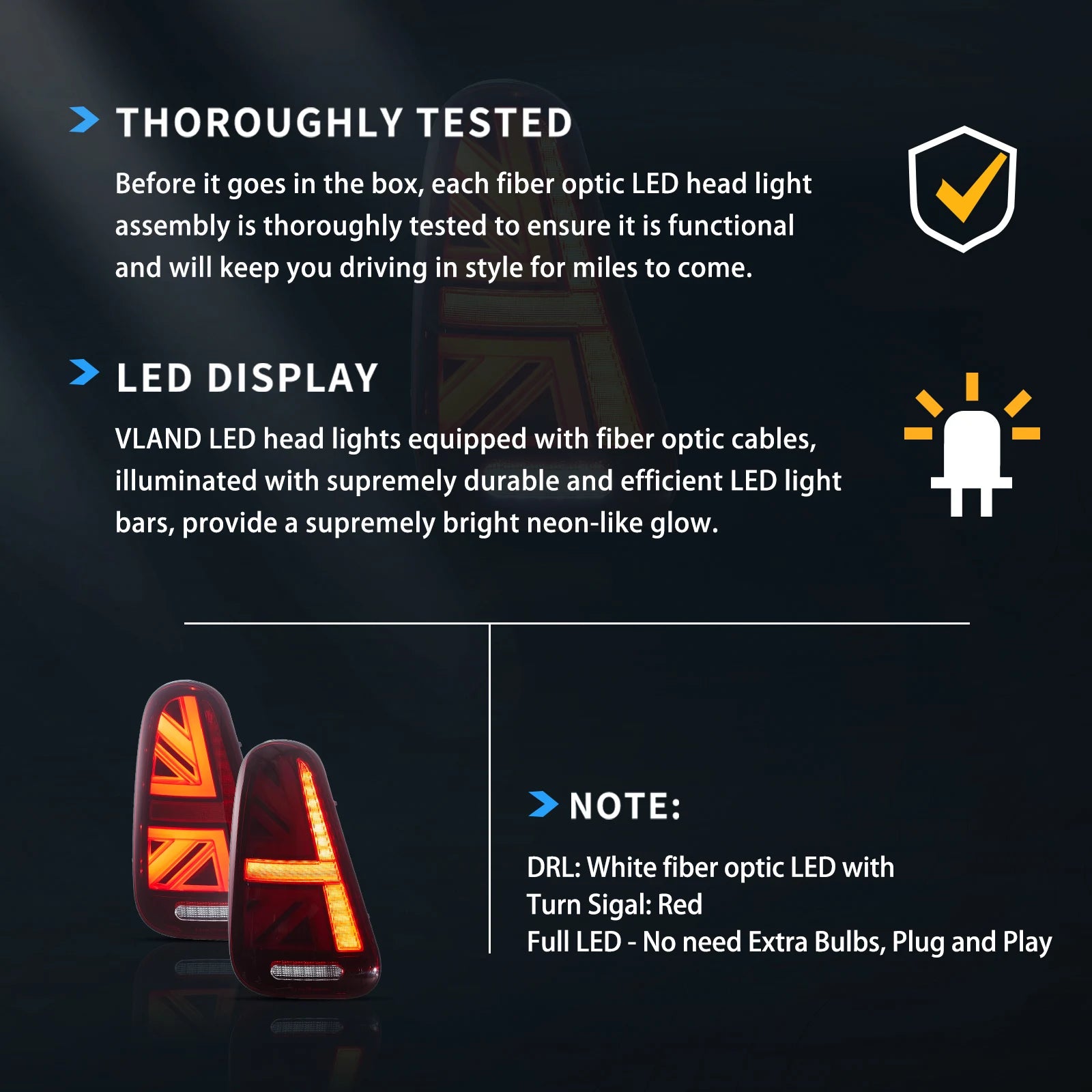 Lampy tylne Full-LED w stylu OEM do Mini Cooper R50/R53 hatch (2001–2006) oraz R52 Cabrio (2004–2008). Czerwone światła pozycyjne, stop, wsteczne i przeciwmgielne z bursztynowymi kierunkowskazami sekwencyjnymi oraz dynamiczną animacją start/powitanie. Plug-and-play na złączach fabrycznych, E-mark cert., szczelność IP67. 1-roczna gwarancja VLAND od dostawy.