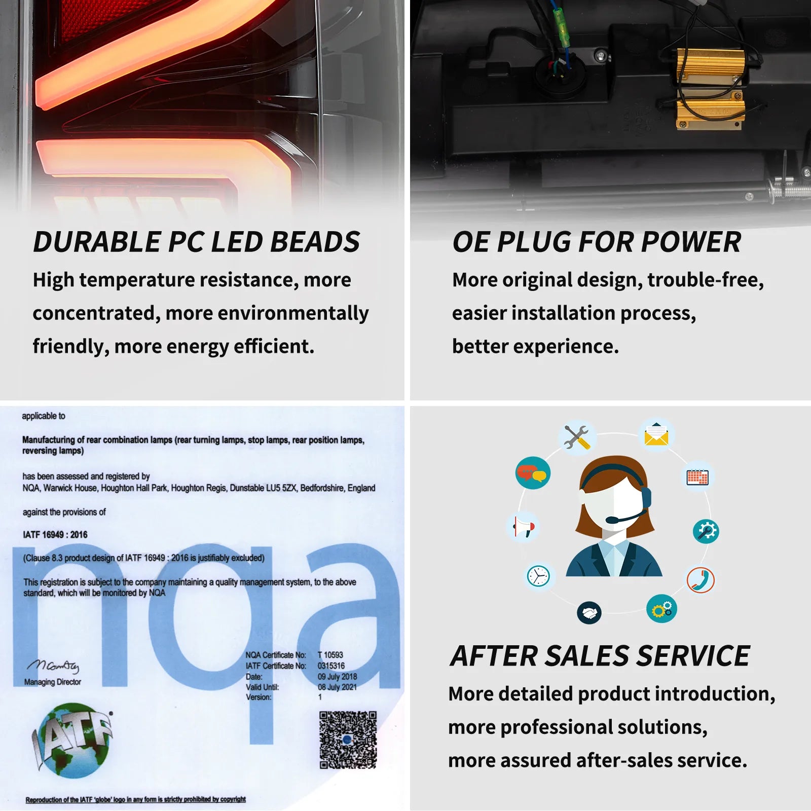 Full-LED tails with red running/brake, bright white reverse and red sequential turn signals — plug-and-play with OE connectors and welcome lighting.