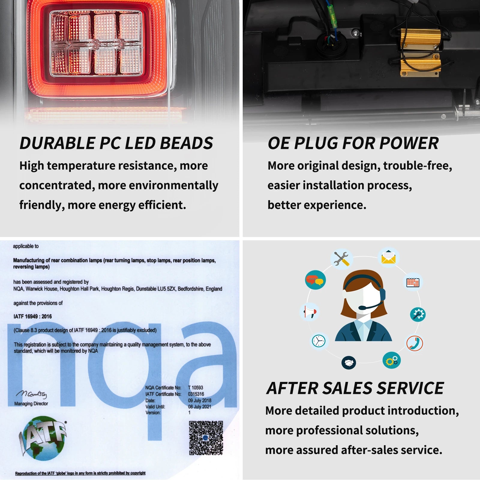Full-LED tails with red running/brake, bright white reverse, and red LED turns — plug-and-play with OE connectors. Smoked finish.