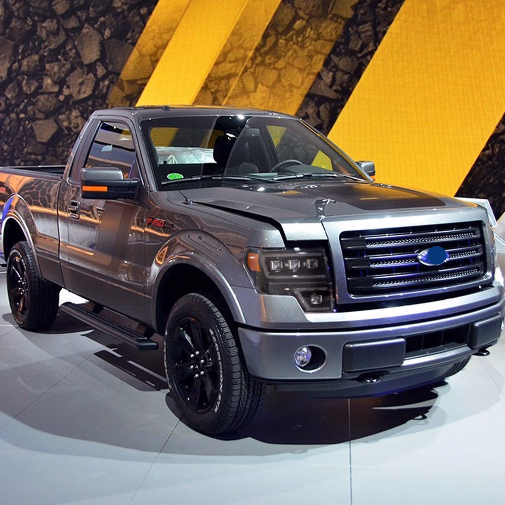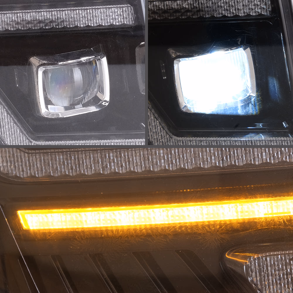 Full-LED dual-projector headlights with white DRL, blue-to-white welcome animation, and amber sequential turn signals. Direct OE-style plug-and-play upgrade for F-150 halogen models.