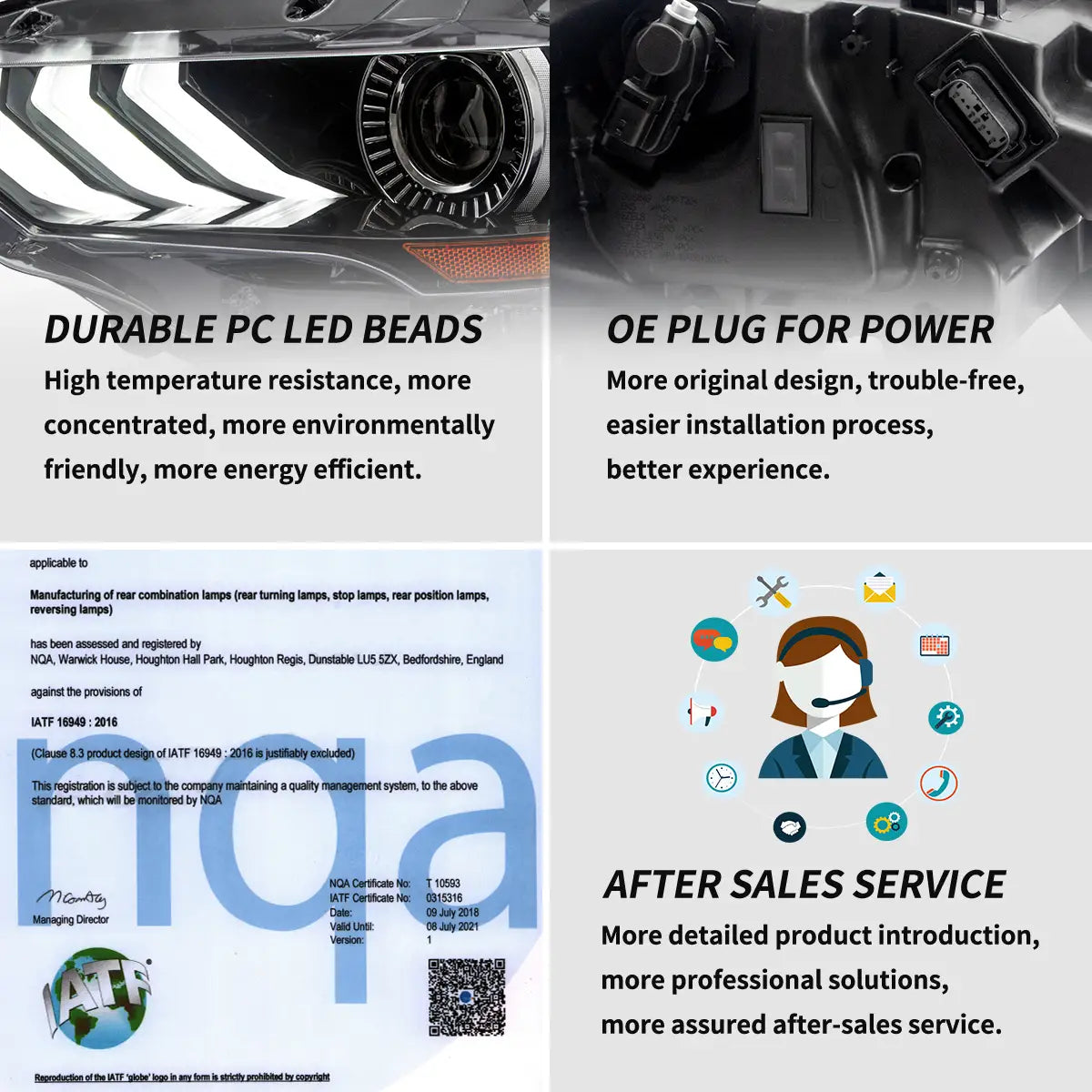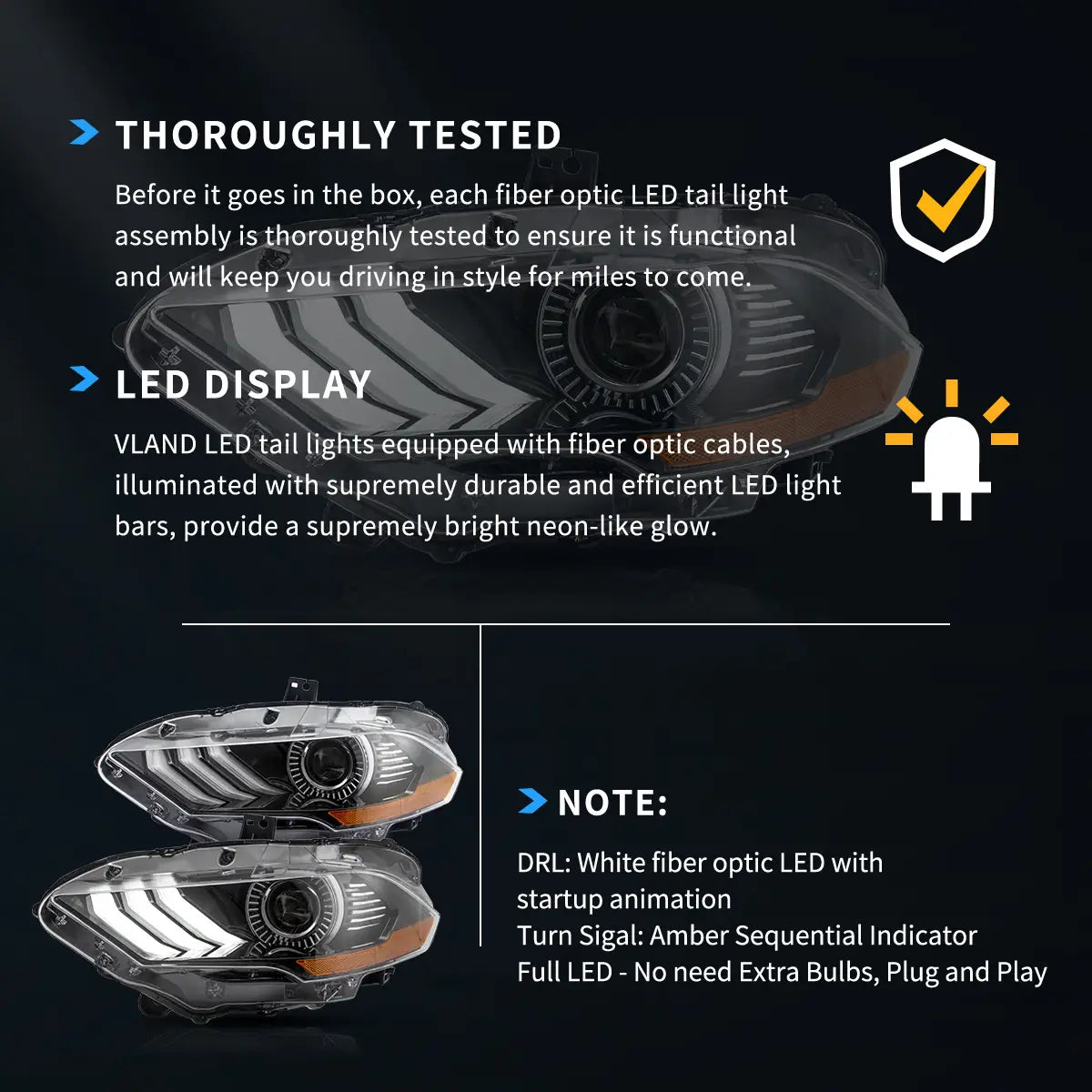 Full LED dual-beam low/high, white LED DRL, and amber turn signals — direct plug-and-play with OE connectors for factory-LED Mustangs.
