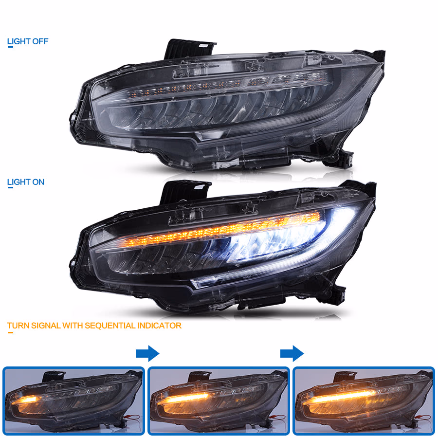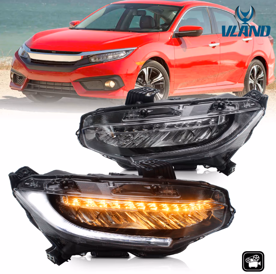 VLAND Honda Civic 10th Gen LED Headlights — 2016–2021 Sedan/Coupe/Hatchback (FC/FK, Full LED, Sequential)