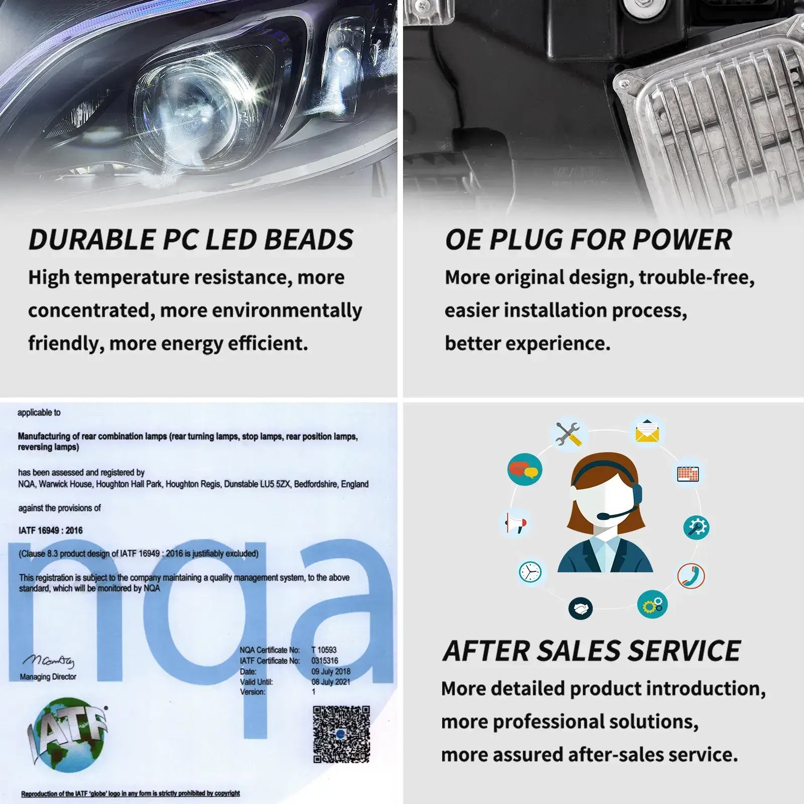 Direct OEM-style full-LED headlamps for the 4th-gen C-Class W205 Coupe & Cabriolet. Bright low/high beams, crisp white LED DRL with start-up animation, and amber sequential turn signals. Plug-and-play with factory connectors.