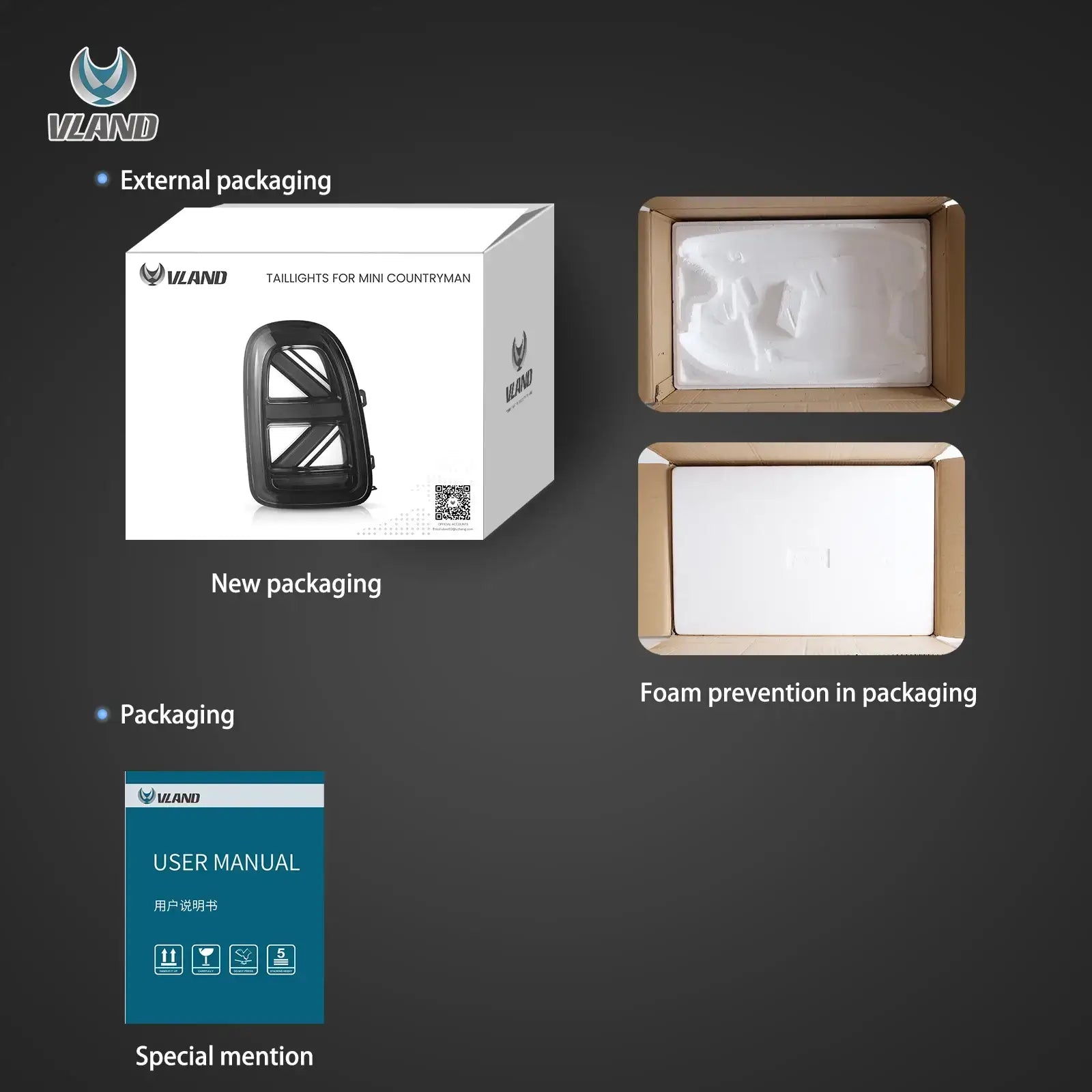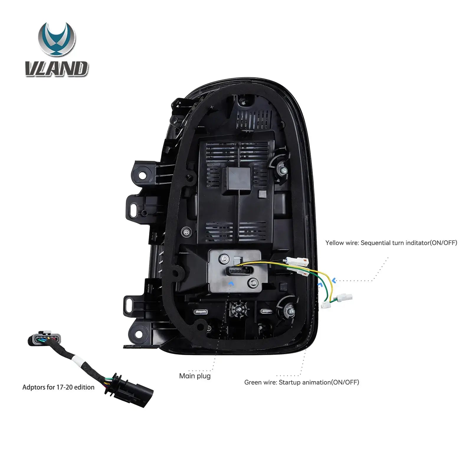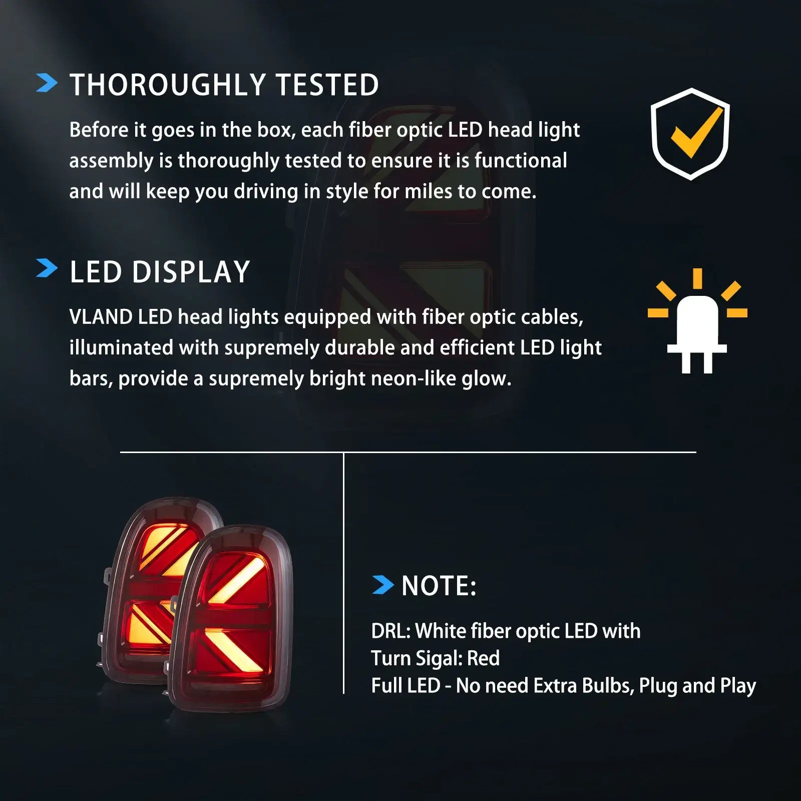 Direct OEM-style full-LED Union Jack taillights for the Mini Countryman F60 (2017–2023). Bright red LED running & brake, crisp white LED reverse, LED rear fog, and optional amber sequential turn signals with welcome/breathe animation. Plug-and-play install with factory connectors, E-mark certified and IP67 sealed. 1-year VLAND warranty from delivery.