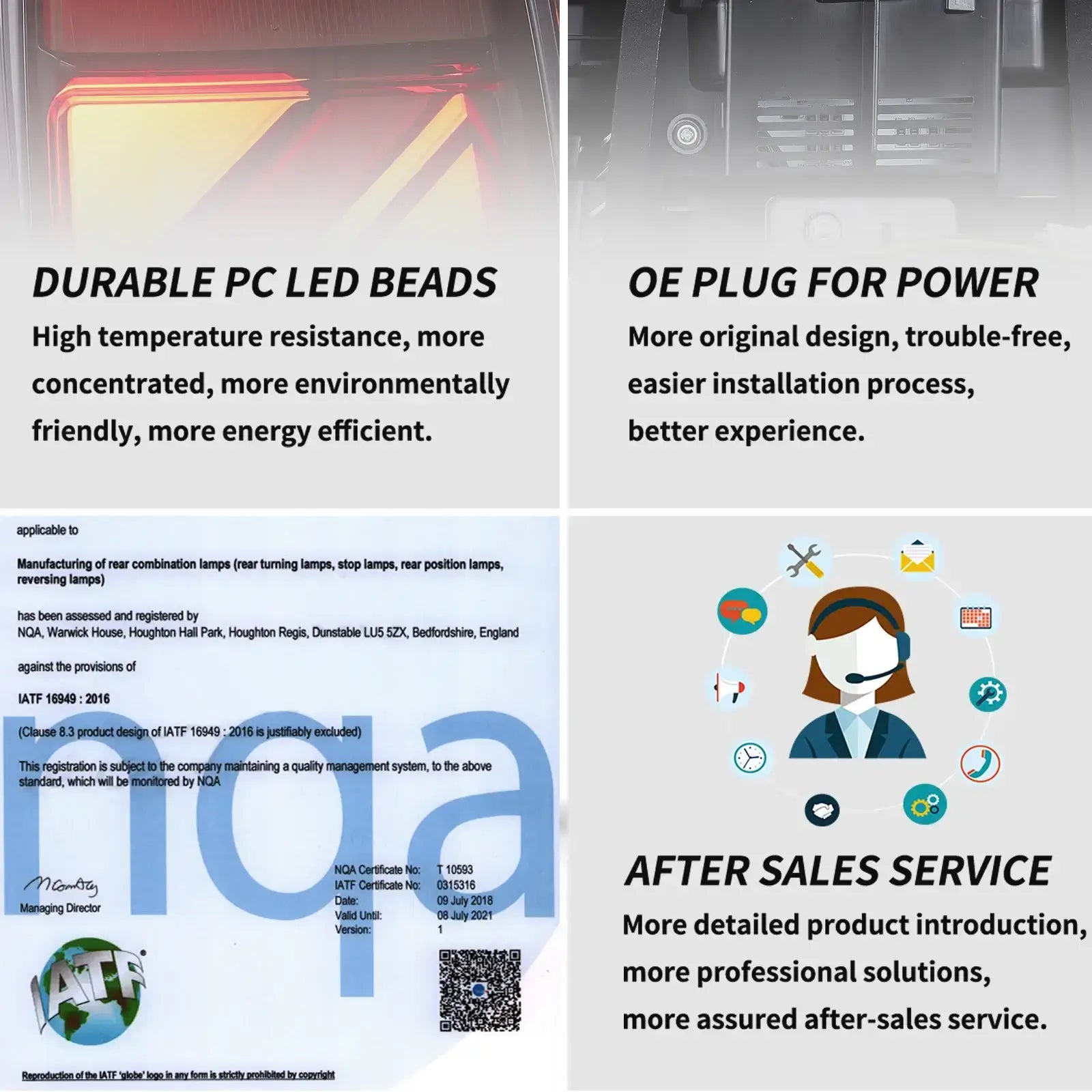 | Functions | LED running (red) w/ animation, LED brake (red), LED reverse (white), LED rear fog (red), LED amber turn (sequential optional) |
