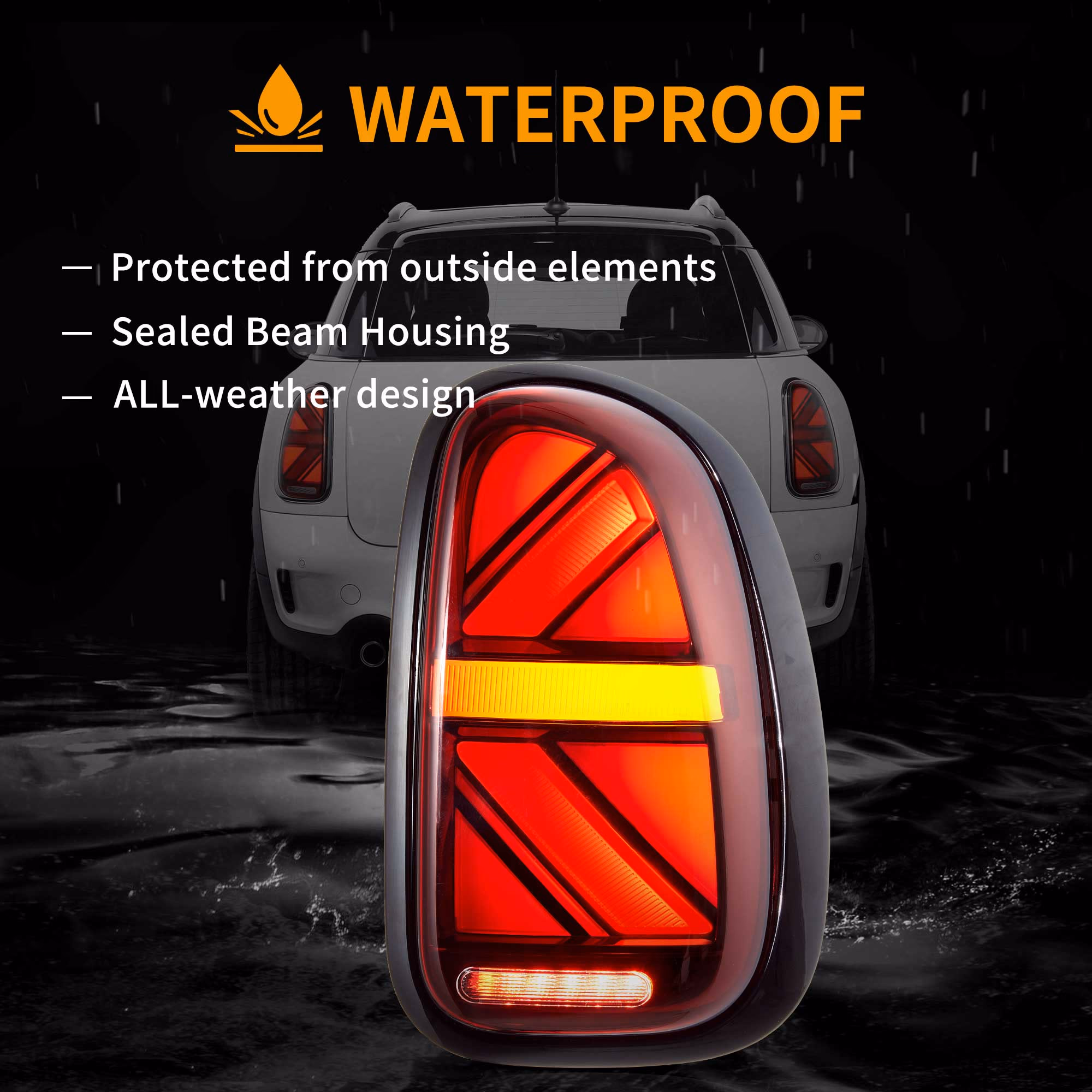 Direct OEM-style full-LED tail lights for Mini Countryman R60 (2010–2016). Bright LED running, brake, reverse and rear fog, plus amber sequential turn signals and a welcome/breathe animation. Plug-and-play with factory connectors. E-mark certified and IP67 sealed. 1-year VLAND warranty from delivery.