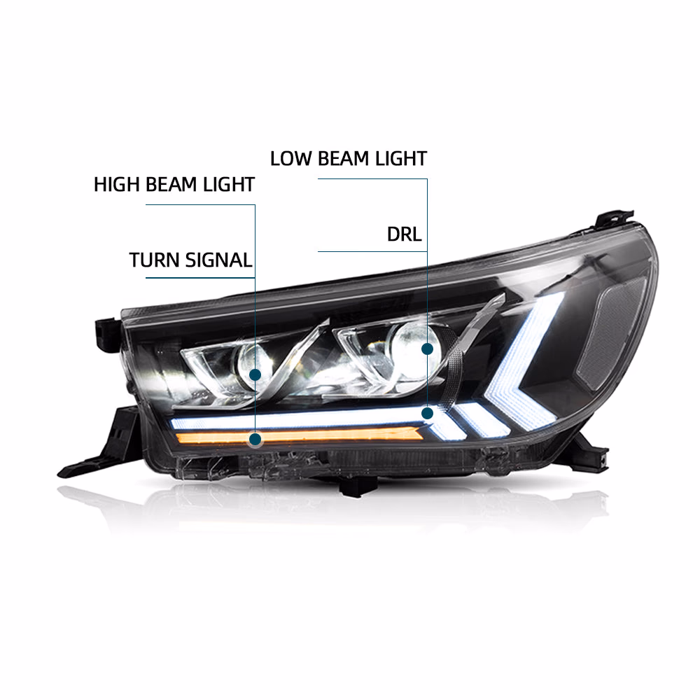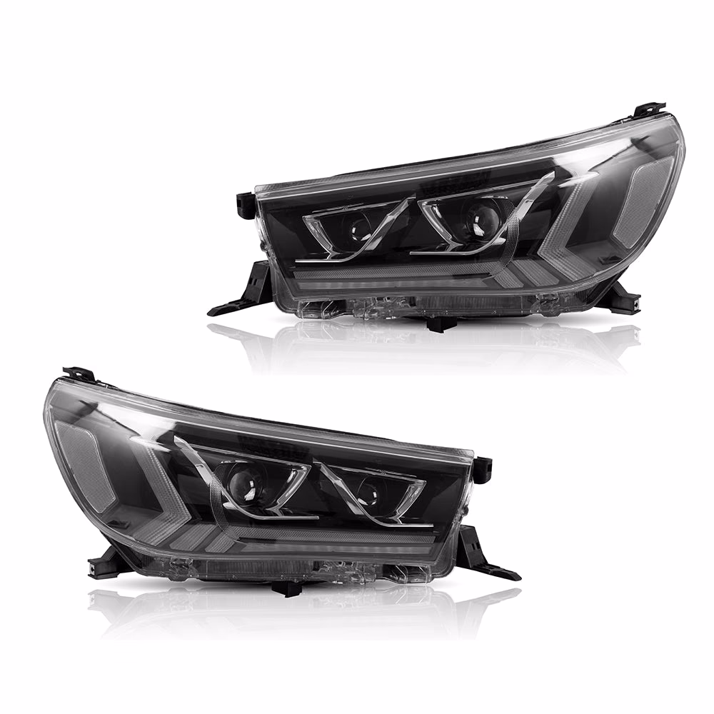 OEM-style plug-and-play headlight upgrade for 2015–2020 Toyota Hilux SR5 (GUN125, GUN126R pre-facelift). Works on trucks with stock halogen or projector headlights. LHD and RHD versions available.