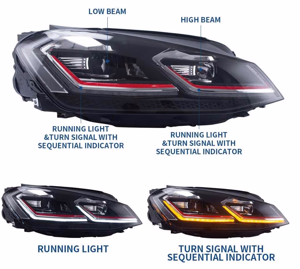 Projector housings ready for D2S / D2R / D2H bulbs (not included), with crisp white DRL and amber sequential indicators — plug-and-play for Mk7.5 halogen cars. ECE E-mark & DOT/SAE certified.