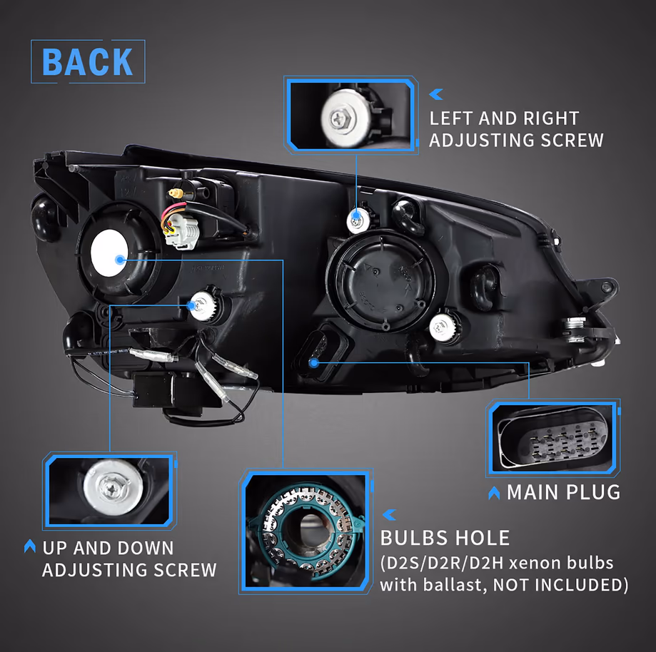 - Bulb-ready upgrade: accepts D2S/D2R/D2H for both low & high beam so you can choose your preferred bulbs/temperature.